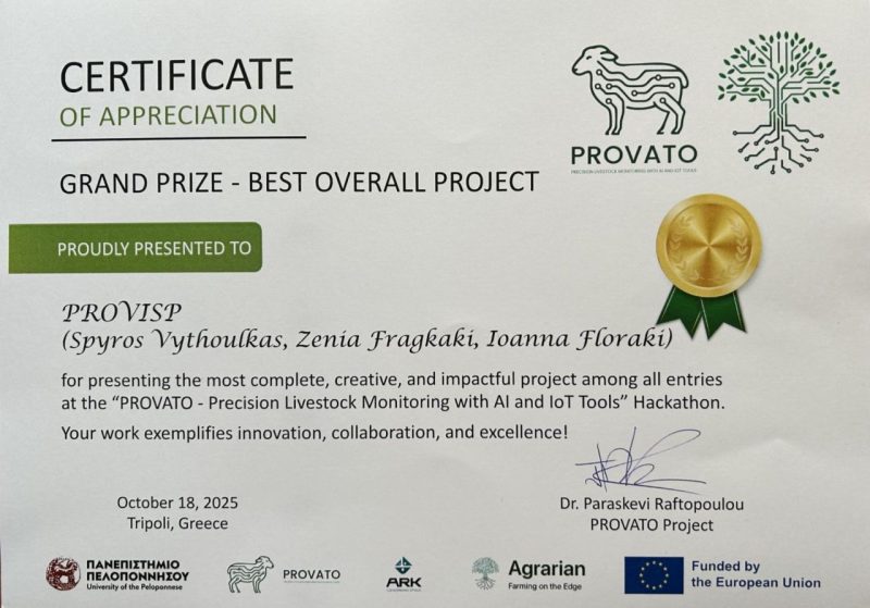 Το project της ομάδας, με τίτλο «PROVISP», αποτελεί ένα έξυπνο σύστημα παρακολούθησης μέσω web εφαρμογής που αξιοποιεί δεδομένα ζώων από περιλαίμια IoT, GPS και μετεωρολογικούς σταθμούς, χρησιμοποιώντας αλγορίθμους μηχανικής μάθησης με σκοπούς: